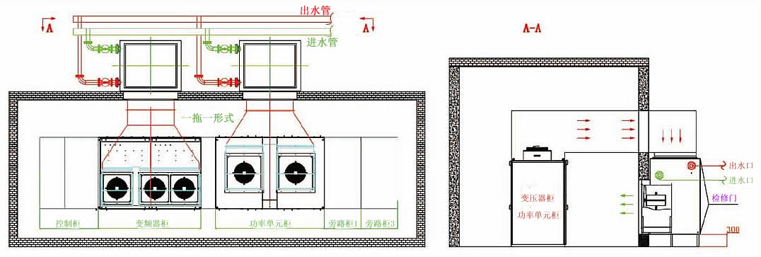 以單套空水冷卻器為例,按照變頻器額定功率6900kW,運行-率96%進行計算,6900kW的變頻器的-大散熱功率為6900×0.4%=276kW,由于空水冷卻器將變頻器排出的熱風全部通過空水冷卻器實現了熱交換,然后將冷風徘徊室內,因此其風路循環-率得到-大提高。風路循環-率接近99%,考慮到-限運行情況下的發熱量,以及水溫偏高,系統交換-率等因素,空水冷卻器的設計裕度通-選擇為1.15~1.2倍,即:變頻器空水冷卻裝置的熱交換功率不小于317kW/套,實際選用冷卻功率為320kW空水冷卻器,每臺變頻器總冷卻風量計算公式為:單臺風機風量×風機臺數,變頻器柜-的風機與空冷系統配置的風機為熱備用結構設計,系統采用室外-閉式循環冷卻,環境溫度控制在40℃以內。當空水冷卻器故障或室內環境溫度較低時,可以將空水冷卻器的水-閥門關小,通過外部環境冷卻保了變頻器室溫度在40℃以下,從而進-步降低變頻器運行成本。
